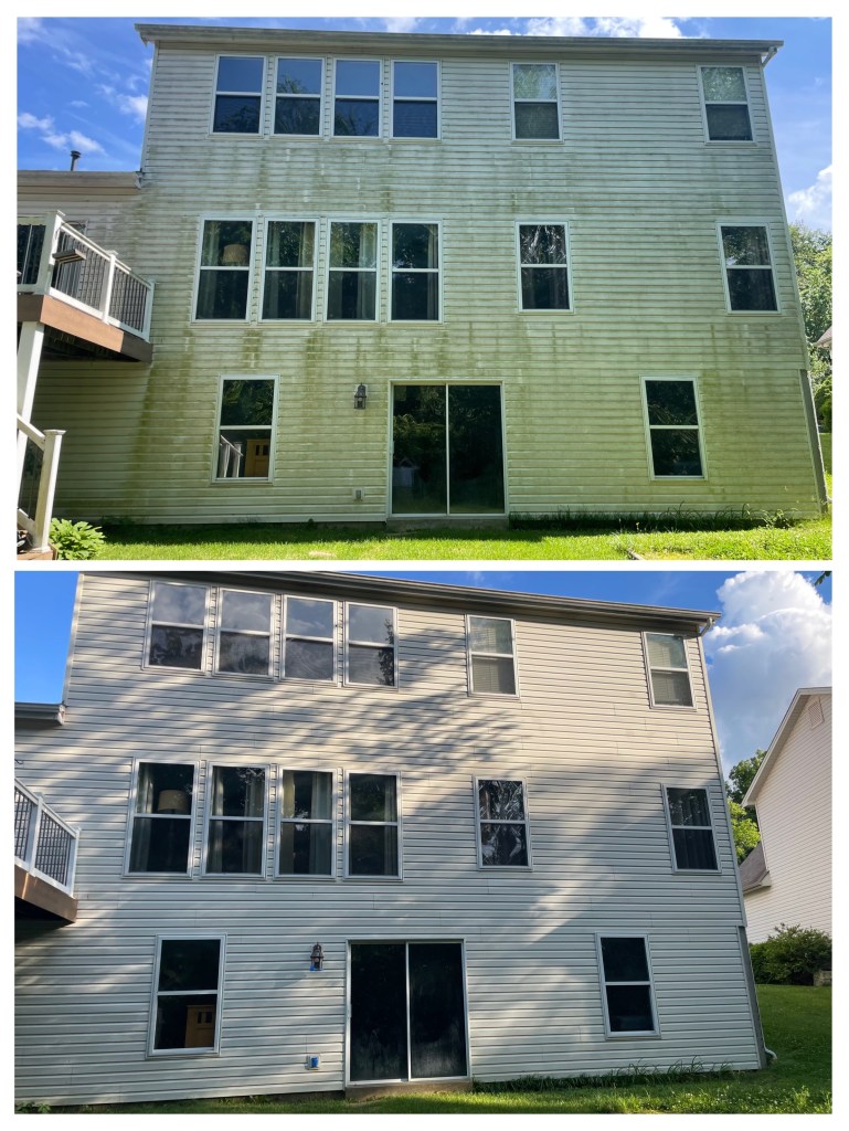 -Driveways/concrete: For our concrete cleaning process we utilize our algaecide solution along with a surface cleaner to remove dirt and organic growth.